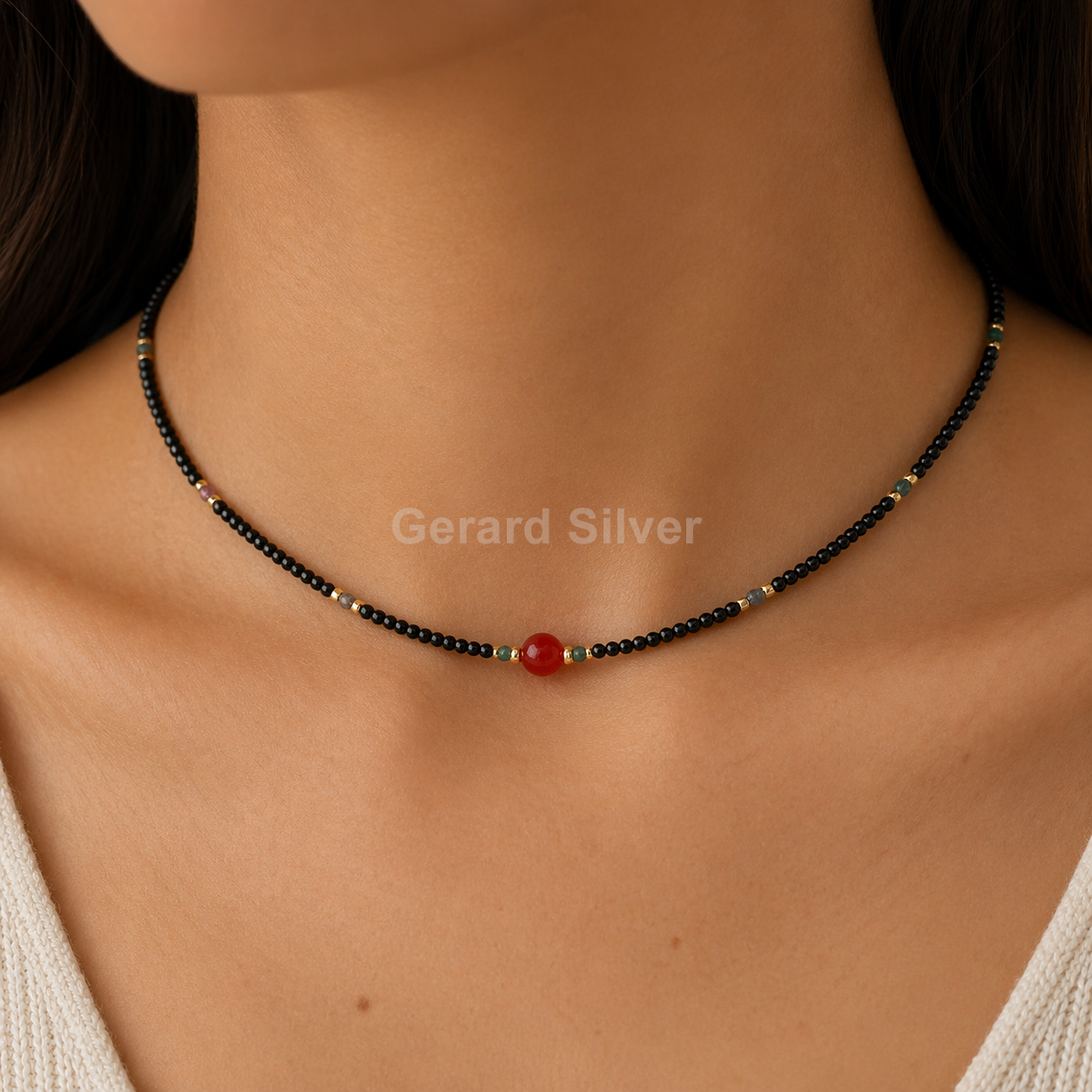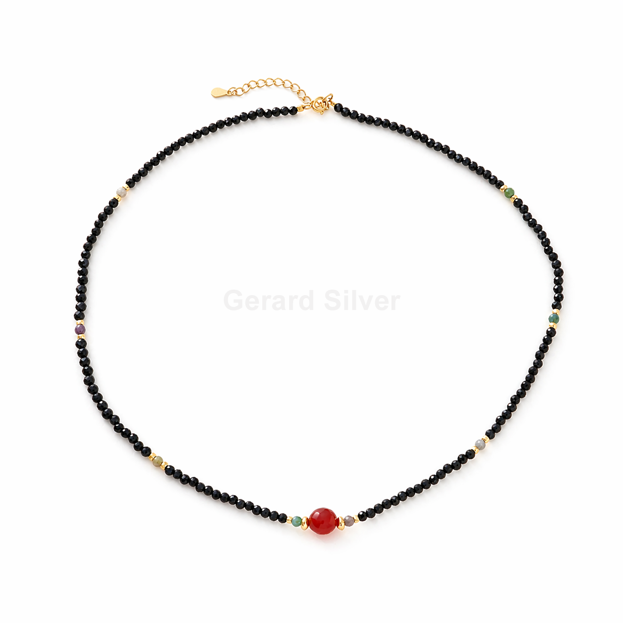 • Colar de prata com minerais naturais, ágata preta e vermelha, com banho de ouro 18k. - CO391